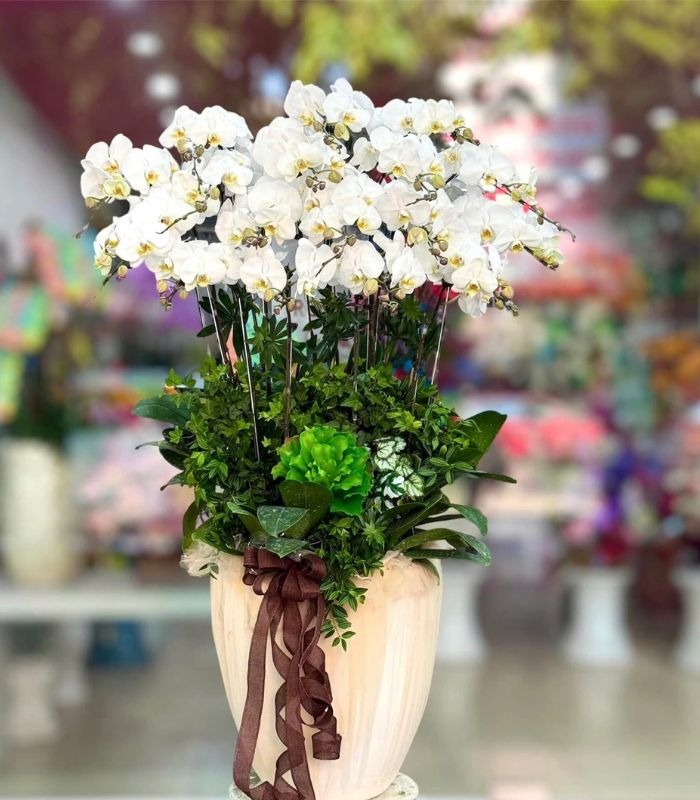 Bảo Ngọc cũng thường xuyên có những mẫu lan hồ điệp phối cùng phụ kiện như ruy băng, đèn led, thiệp cứng – giúp chậu hoa vừa ấn tượng về thị giác, vừa mang tính biểu tượng cao trong ngày đặc biệt. Nếu bạn đang cần tìm hoa cho buổi lễ trang trọng, thì đừng bỏ lỡ địa chỉ này.